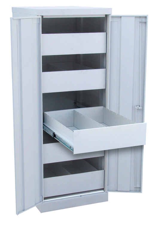 Шкаф ШК-5-Д2 оборудован распашными дверцами и пятью выдвижными ящиками на телескопических направляющих, в которых с удобством размещаются документы формата A5. Ящики разделены перегородкой, которая образует два отделения размером 120x216x270 мм.